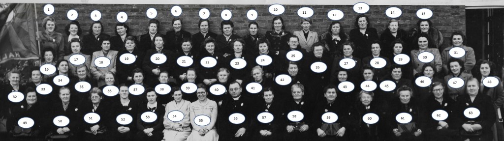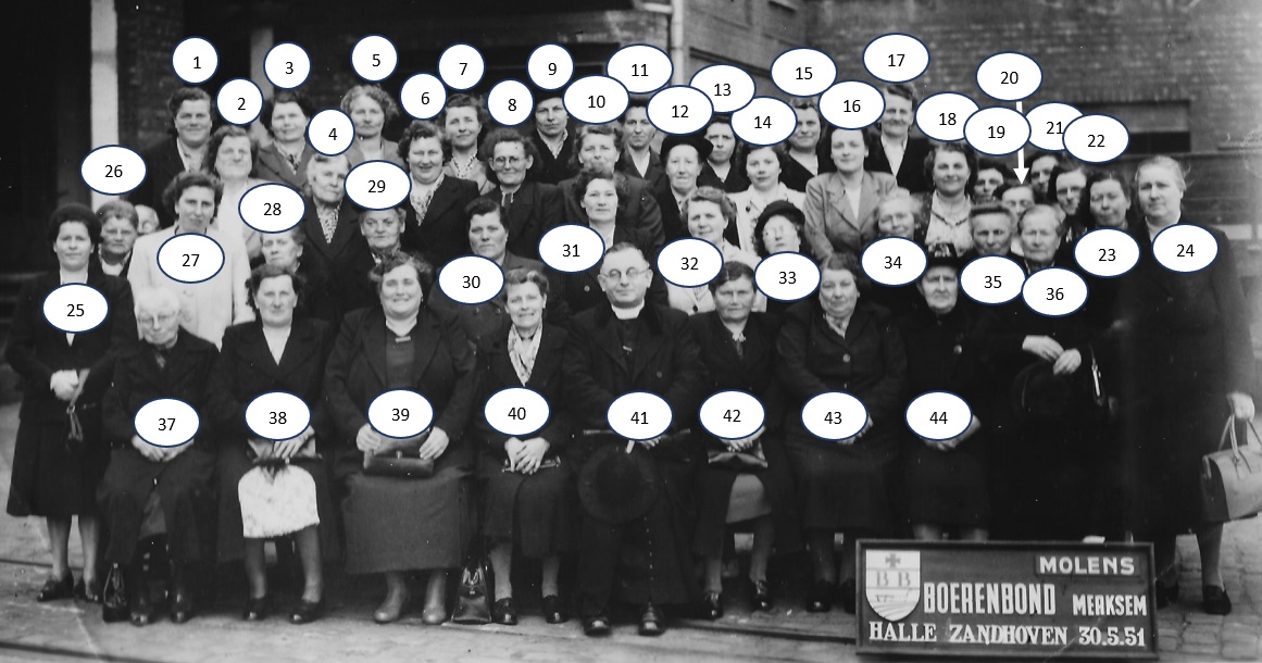 | 3 Maria (Mit) Van de Cloot (x JosTaeymans) | 16 Marieke Van der Schoot (x Jos Keysers) | 29 Martha Deckers (x Karel Van Hemeldonck) | 42 Stephanie Claessens (x Karel Van de Mier) | 55 juffrouw Staelens (afgevaardigde Boerinnenbond hoofdzetel Leuven) |