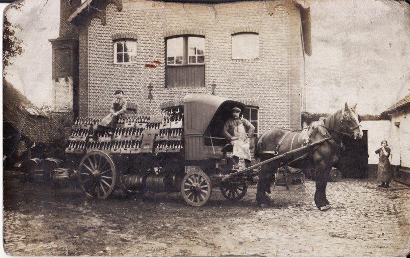De bedeling aan huis gebeurde vroeger met een open platte wagen, getrokken door 2 muilezels. Deze werden gekocht in Antwerpen waar ze met een boot toekwamen. Later werden zij vervangen door paarden, en nog later door een vrachtwagen. Men vertrok ’s morgens met paard en wagen om de mensen van drank te voorzien. ’s Middags kwam men terug om de paarden eten te geven, die dan werden uitgespannen zodat ze even konden rusten alvorens hun ronde verder te zetten.