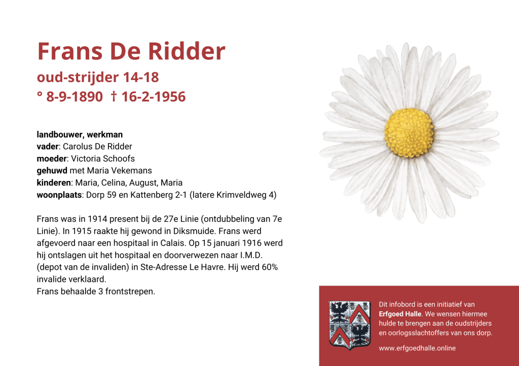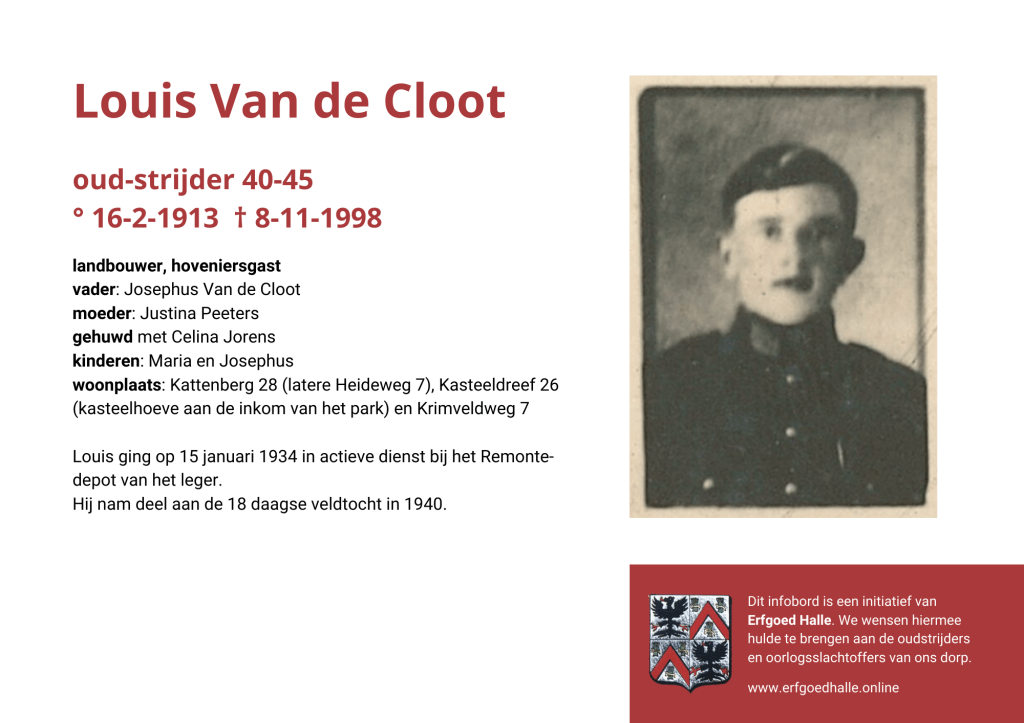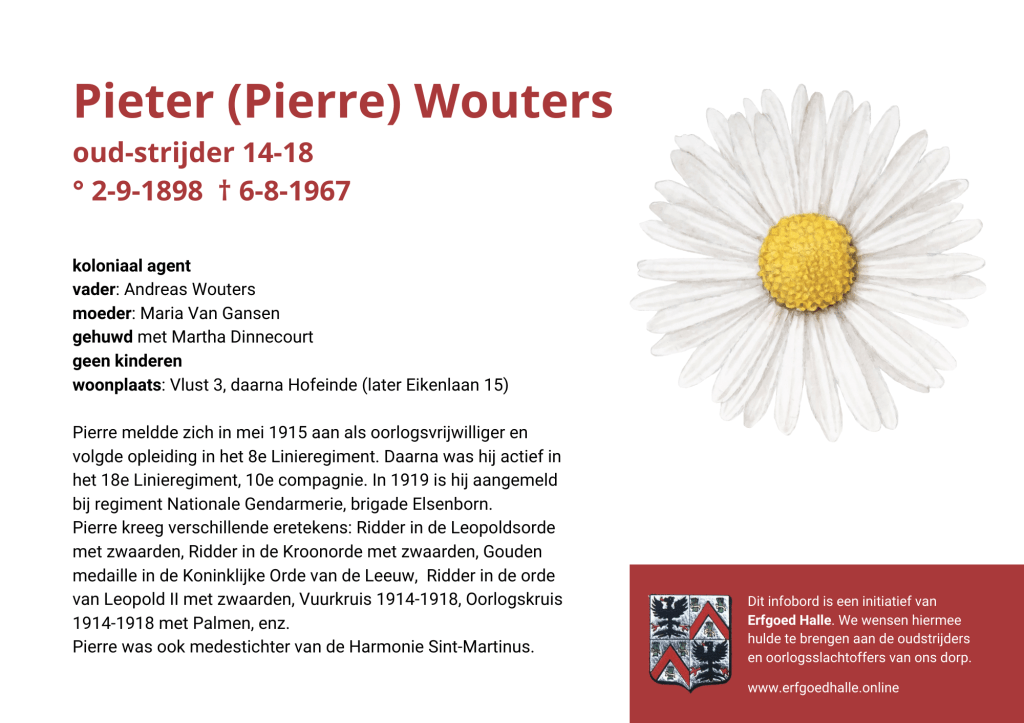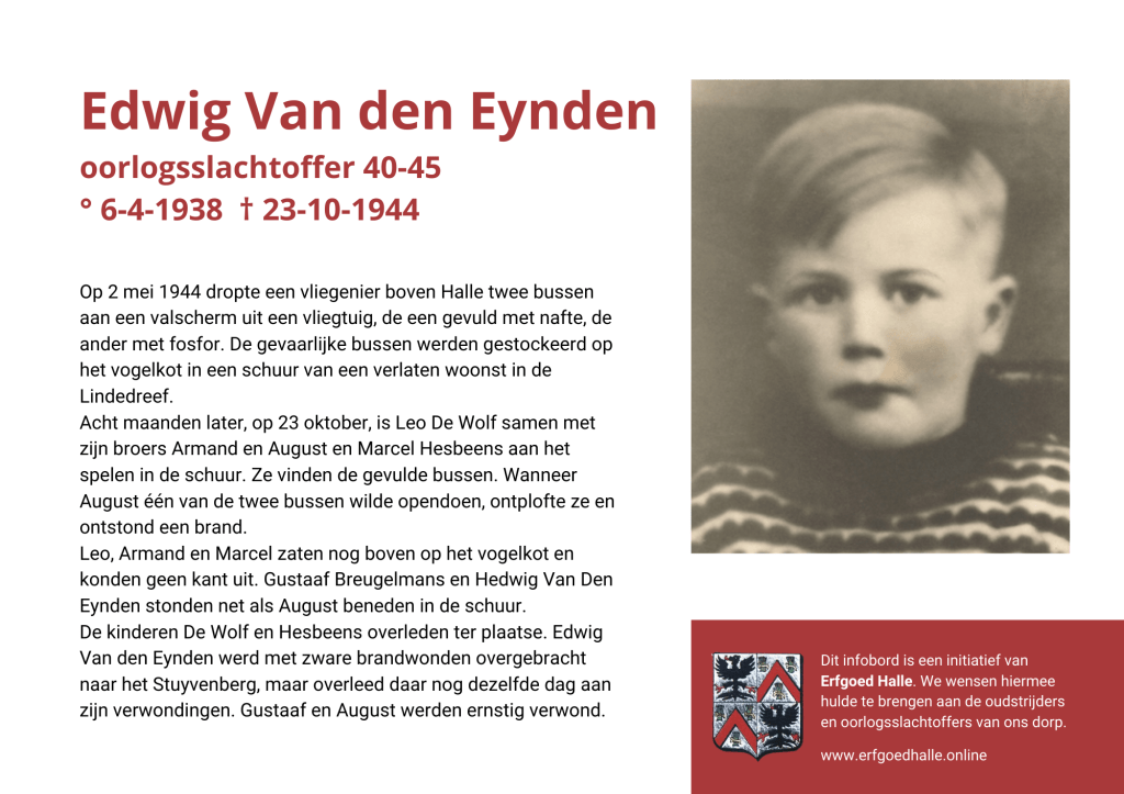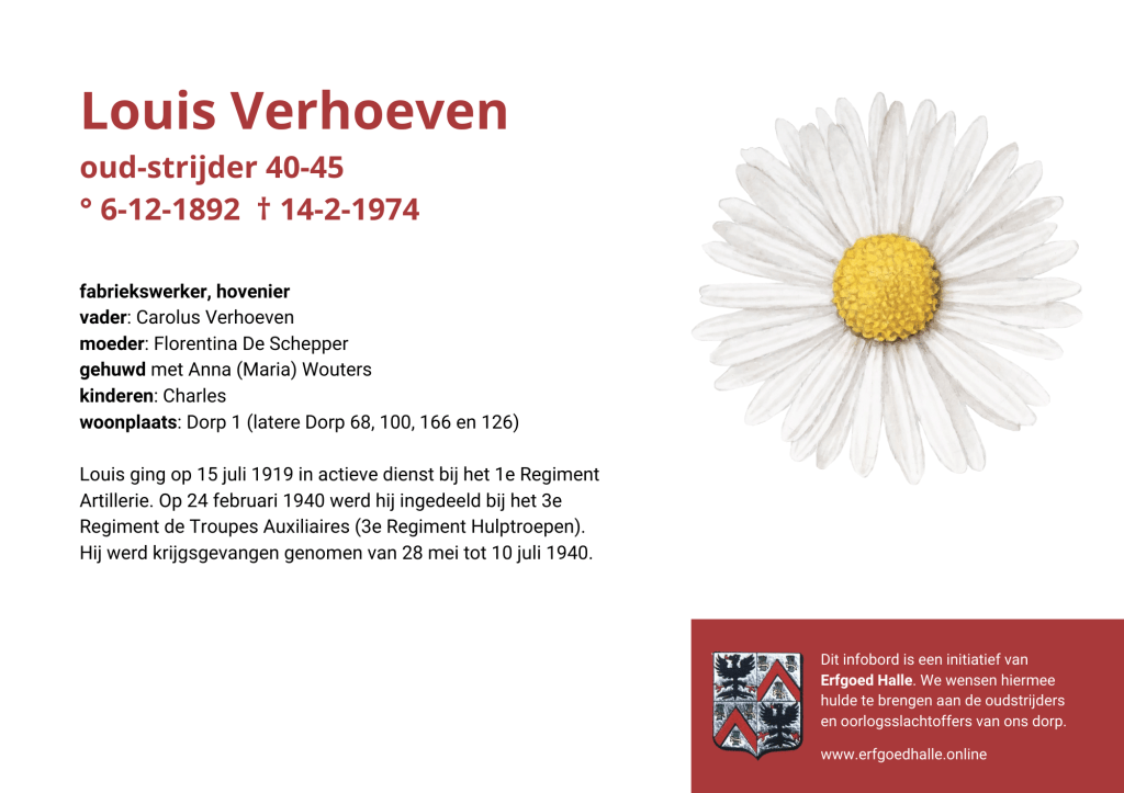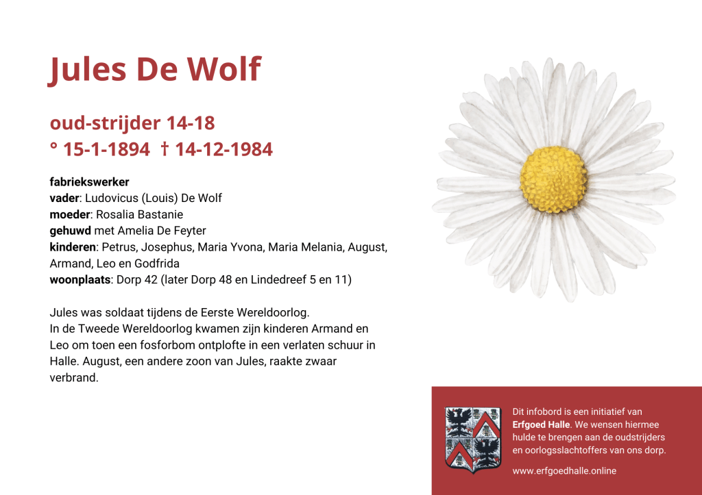 Danny Van de Velde: “We hebben vanuit Erfgoed Halle de voorbije jaren heel veel informatie en documentatie verzameld over onze oud-strijders en de oorlogsslachtoffers die te betreuren vielen. Naar aanleiding van 80 jaar bevrijding van Halle wilden we graag hulde brengen aan hen. Daarom maakten we herinneringsbordjes met meer informatie. Wat was hun beroep, wie waren hun ouders en kinderen, waar hebben ze gewoond? Van heel wat Hallenaren hebben we ook meer info en ook een foto uit het militair dossier toegevoegd. Op de herinneringsbordjes van wie we geen foto hebben, plaatsten we een madeliefje.”