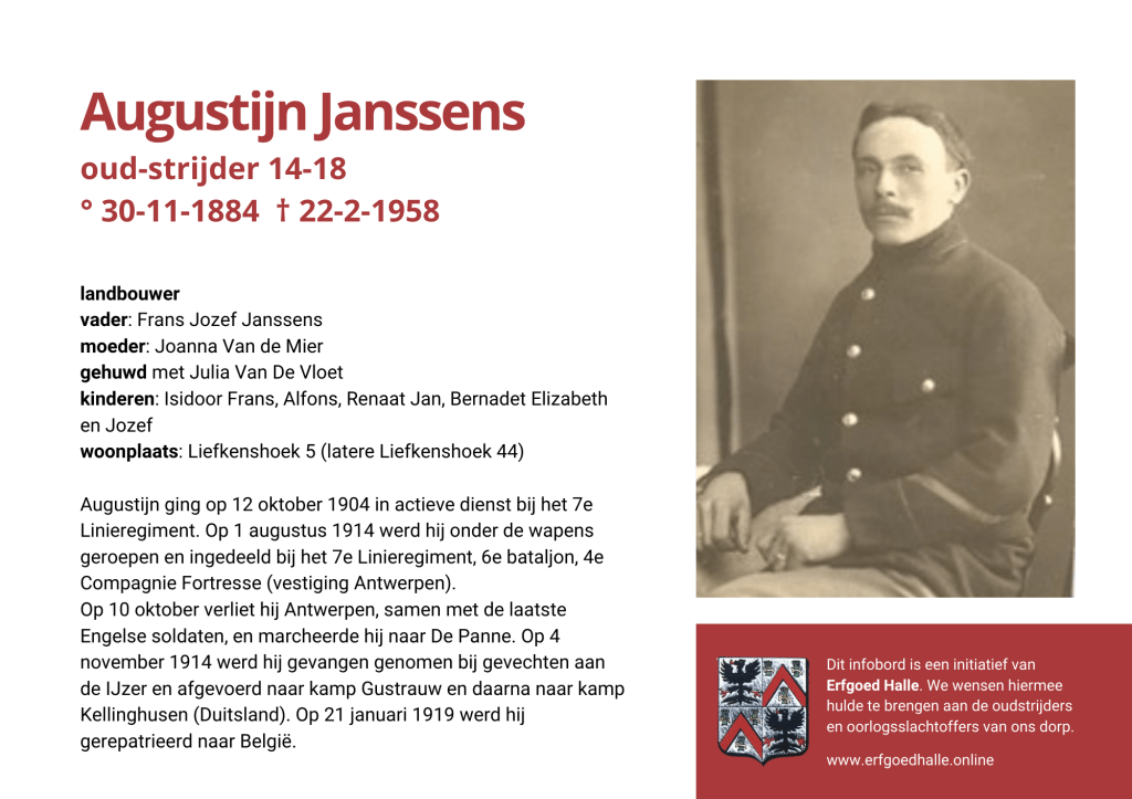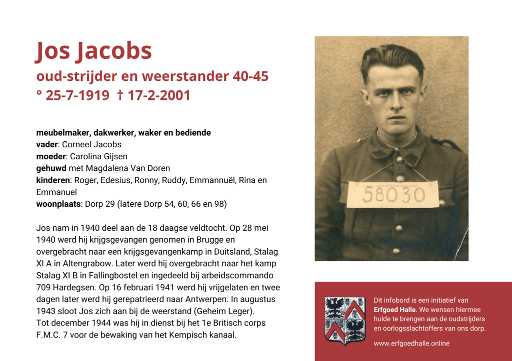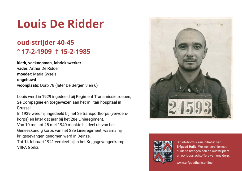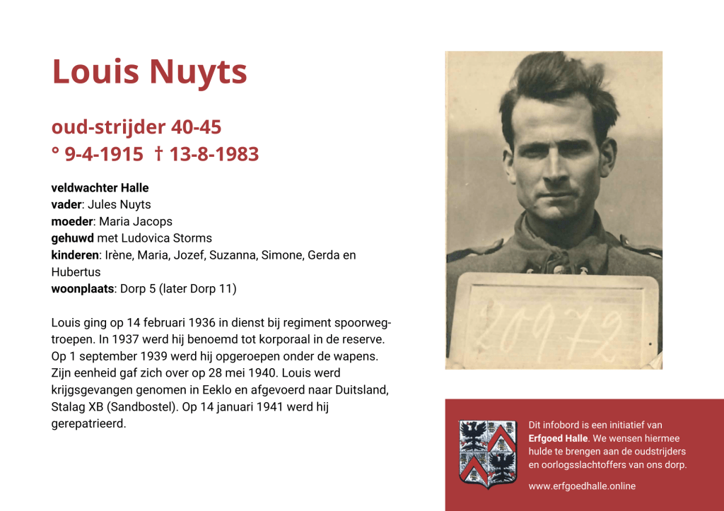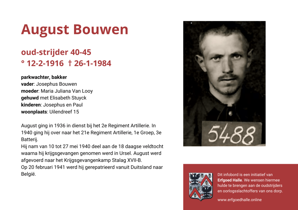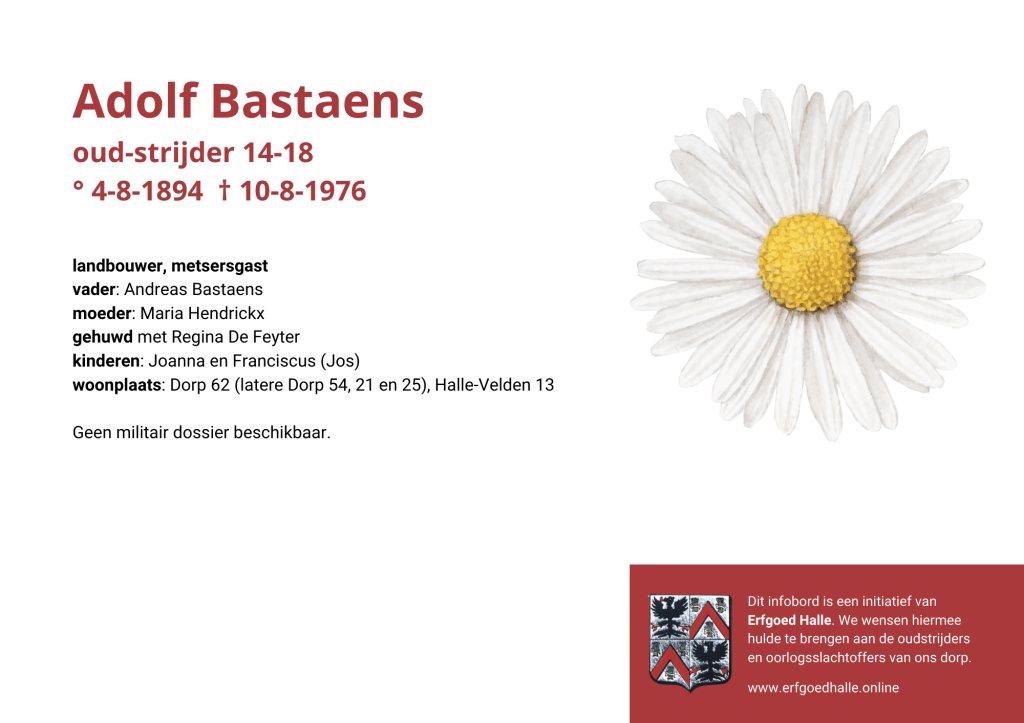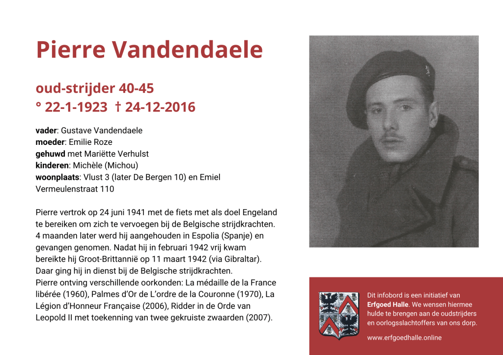 Danny Van de Velde: “We hebben vanuit Erfgoed Halle de voorbije jaren heel veel informatie en documentatie verzameld over onze oud-strijders en de oorlogsslachtoffers die te betreuren vielen. Naar aanleiding van 80 jaar bevrijding van Halle wilden we graag hulde brengen aan hen. Daarom maakten we herinneringsbordjes met meer informatie. Wat was hun beroep, wie waren hun ouders en kinderen, waar hebben ze gewoond? Van heel wat Hallenaren hebben we ook meer info en ook een foto uit het militair dossier toegevoegd. Op de herinneringsbordjes van wie we geen foto hebben, plaatsten we een madeliefje.”