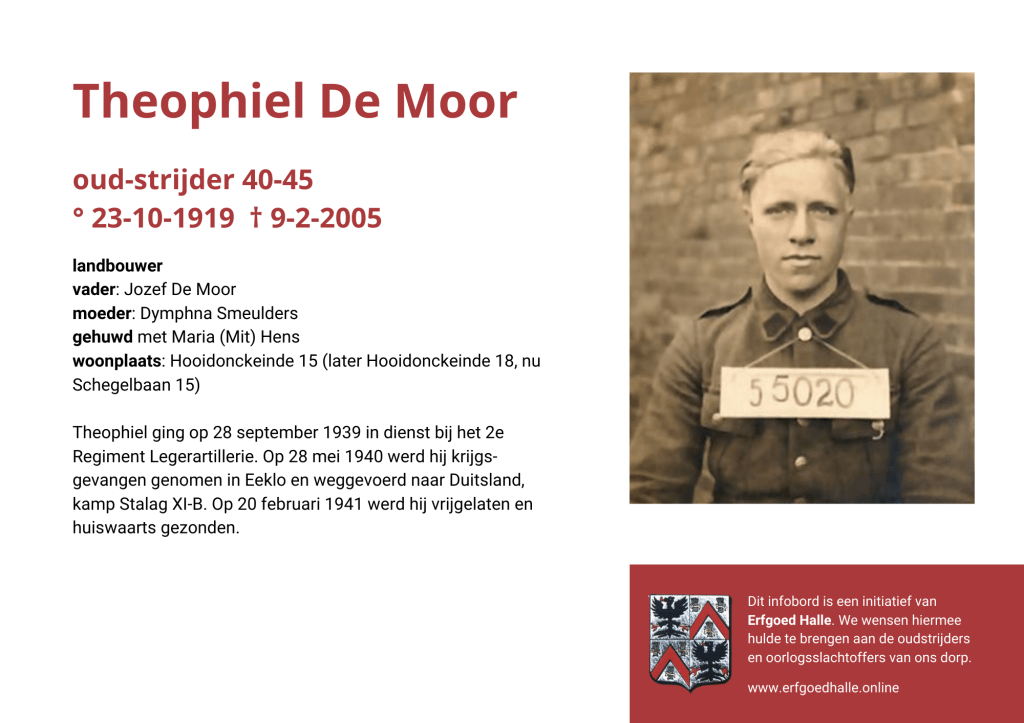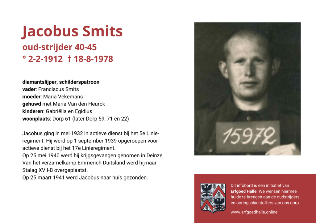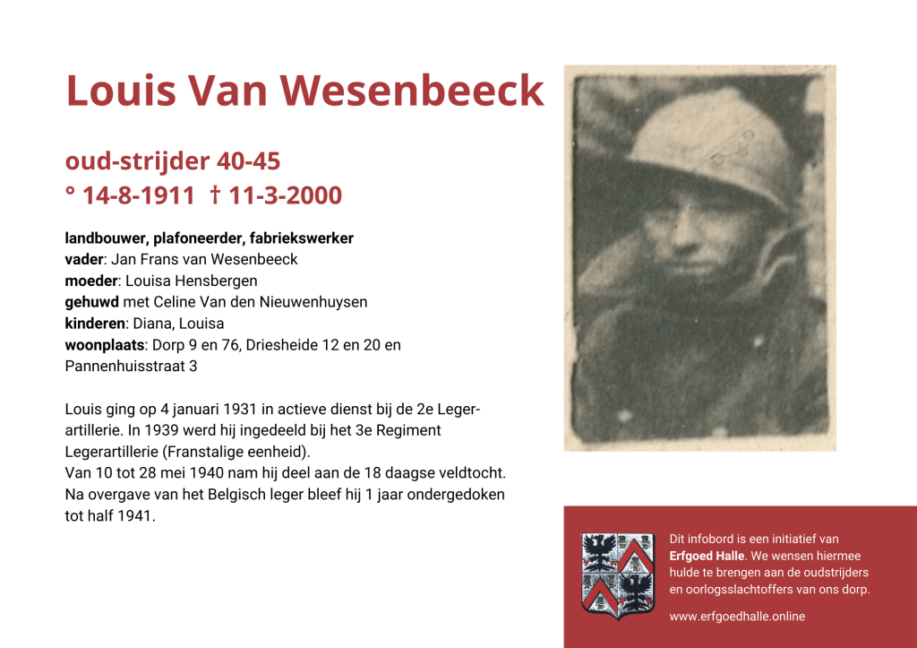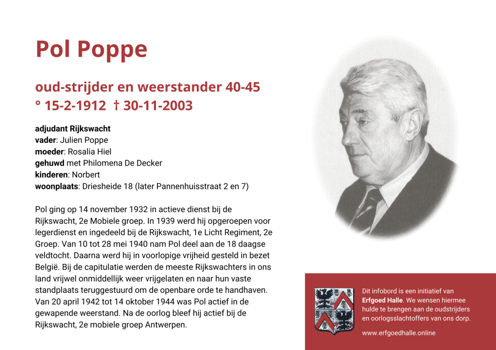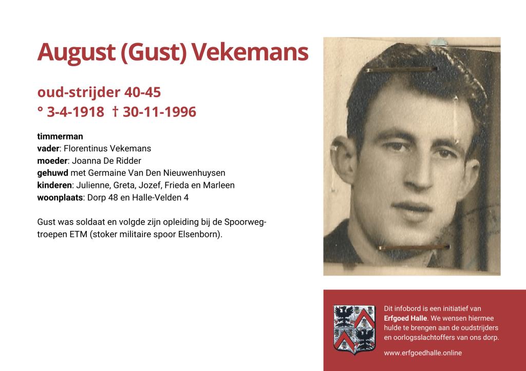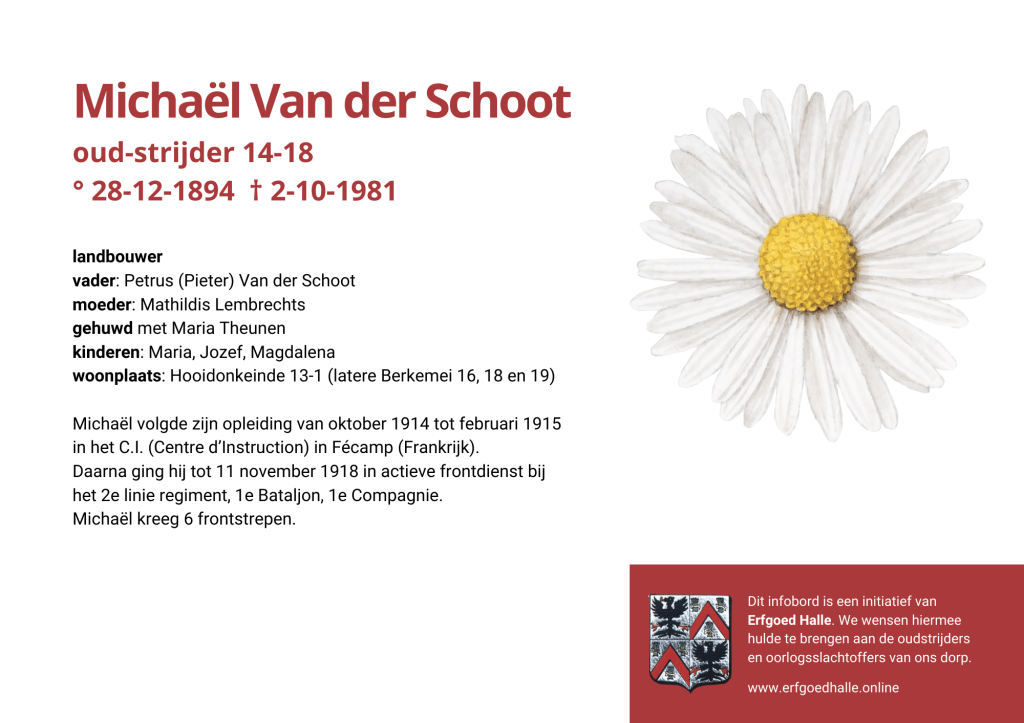 Danny Van de Velde: “We hebben vanuit Erfgoed Halle de voorbije jaren heel veel informatie en documentatie verzameld over onze oud-strijders en de oorlogsslachtoffers die te betreuren vielen. Naar aanleiding van 80 jaar bevrijding van Halle wilden we graag hulde brengen aan hen. Daarom maakten we herinneringsbordjes met meer informatie. Wat was hun beroep, wie waren hun ouders en kinderen, waar hebben ze gewoond? Van heel wat Hallenaren hebben we ook meer info en ook een foto uit het militair dossier toegevoegd. Op de herinneringsbordjes van wie we geen foto hebben, plaatsten we een madeliefje.”
