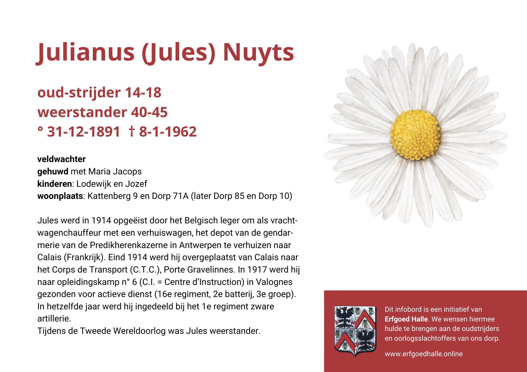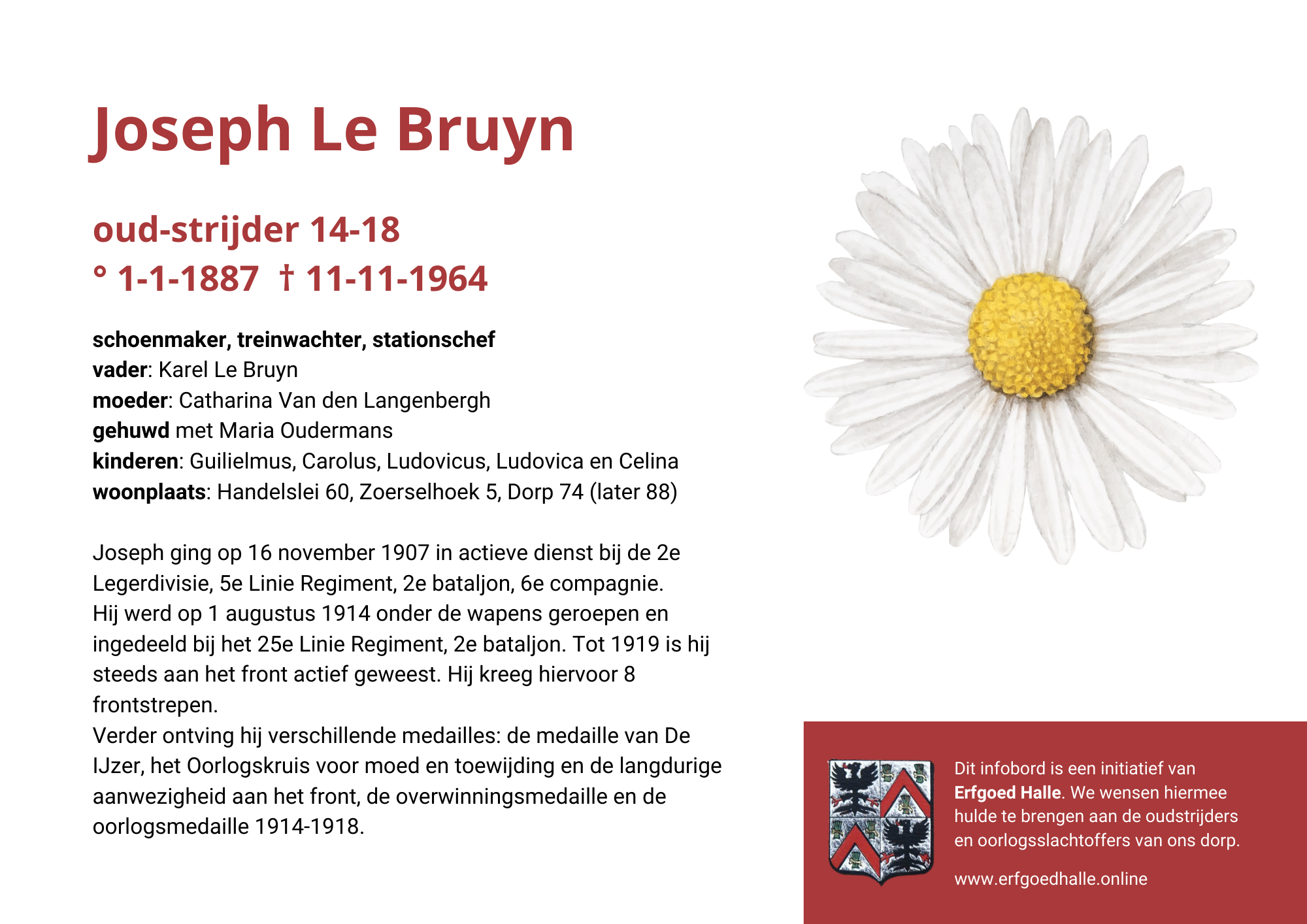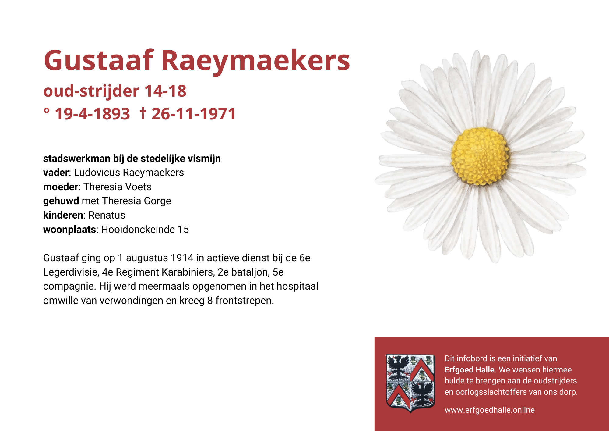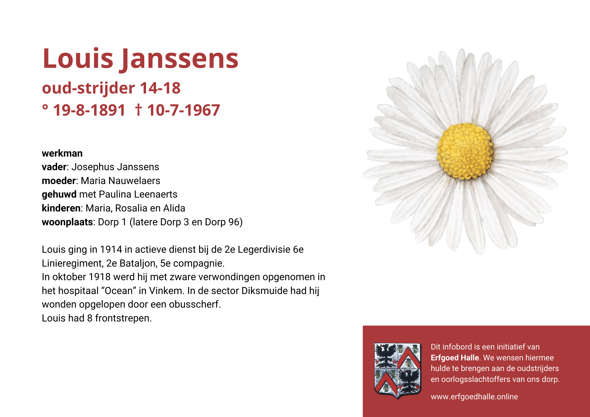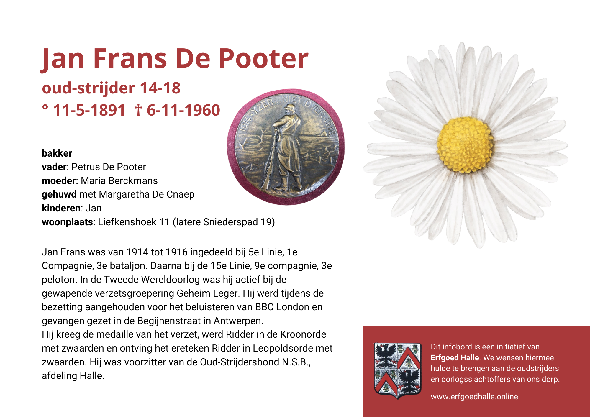 Danny Van de Velde: “We hebben vanuit Erfgoed Halle de voorbije jaren heel veel informatie en documentatie verzameld over onze oud-strijders en de oorlogsslachtoffers die te betreuren vielen. Naar aanleiding van 80 jaar bevrijding van Halle wilden we graag hulde brengen aan hen. Daarom maakten we herinneringsbordjes met meer informatie. Wat was hun beroep, wie waren hun ouders en kinderen, waar hebben ze gewoond? Van heel wat Hallenaren hebben we ook meer info en ook een foto uit het militair dossier toegevoegd. Op de herinneringsbordjes van wie we geen foto hebben, plaatsten we een madeliefje.”