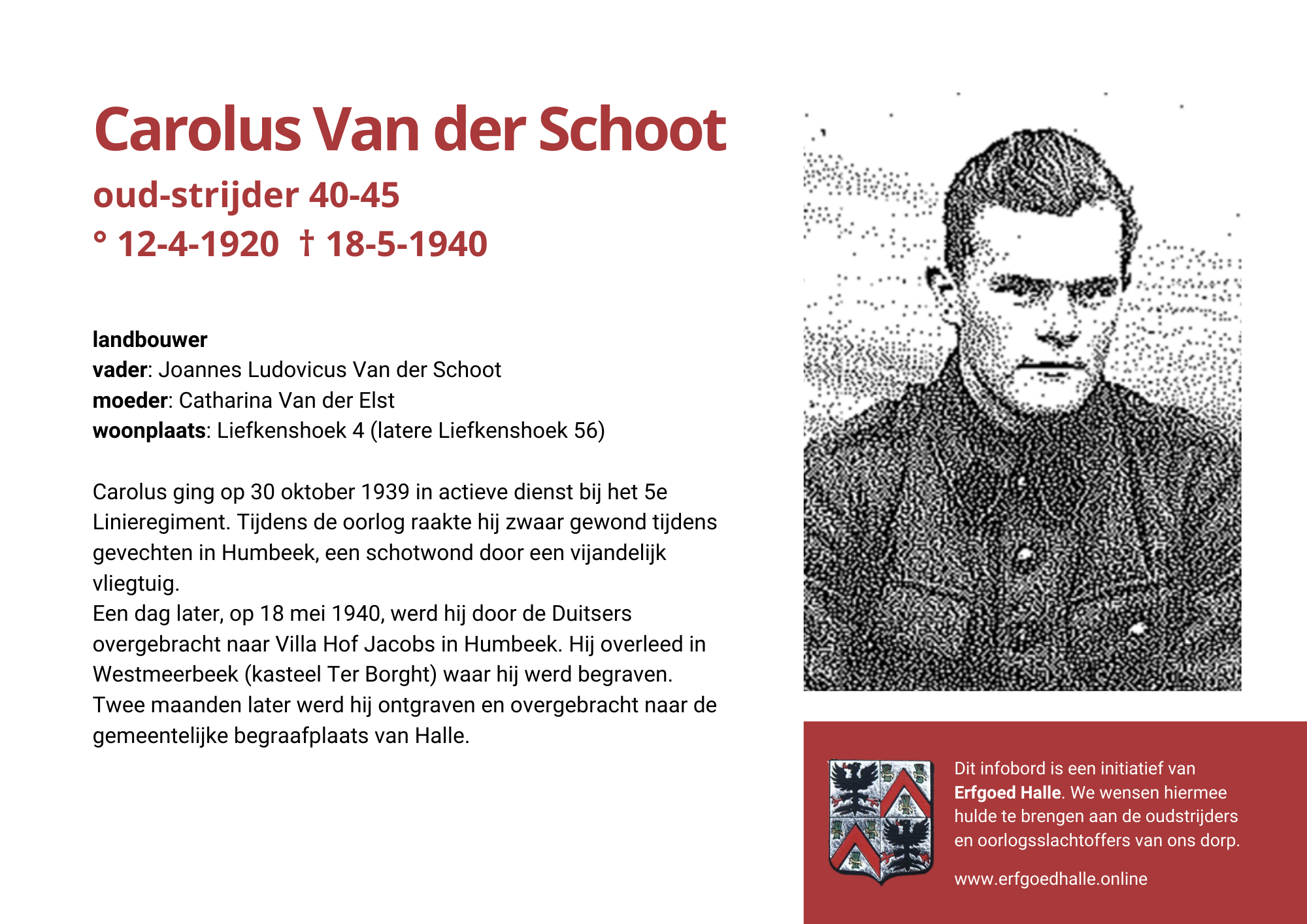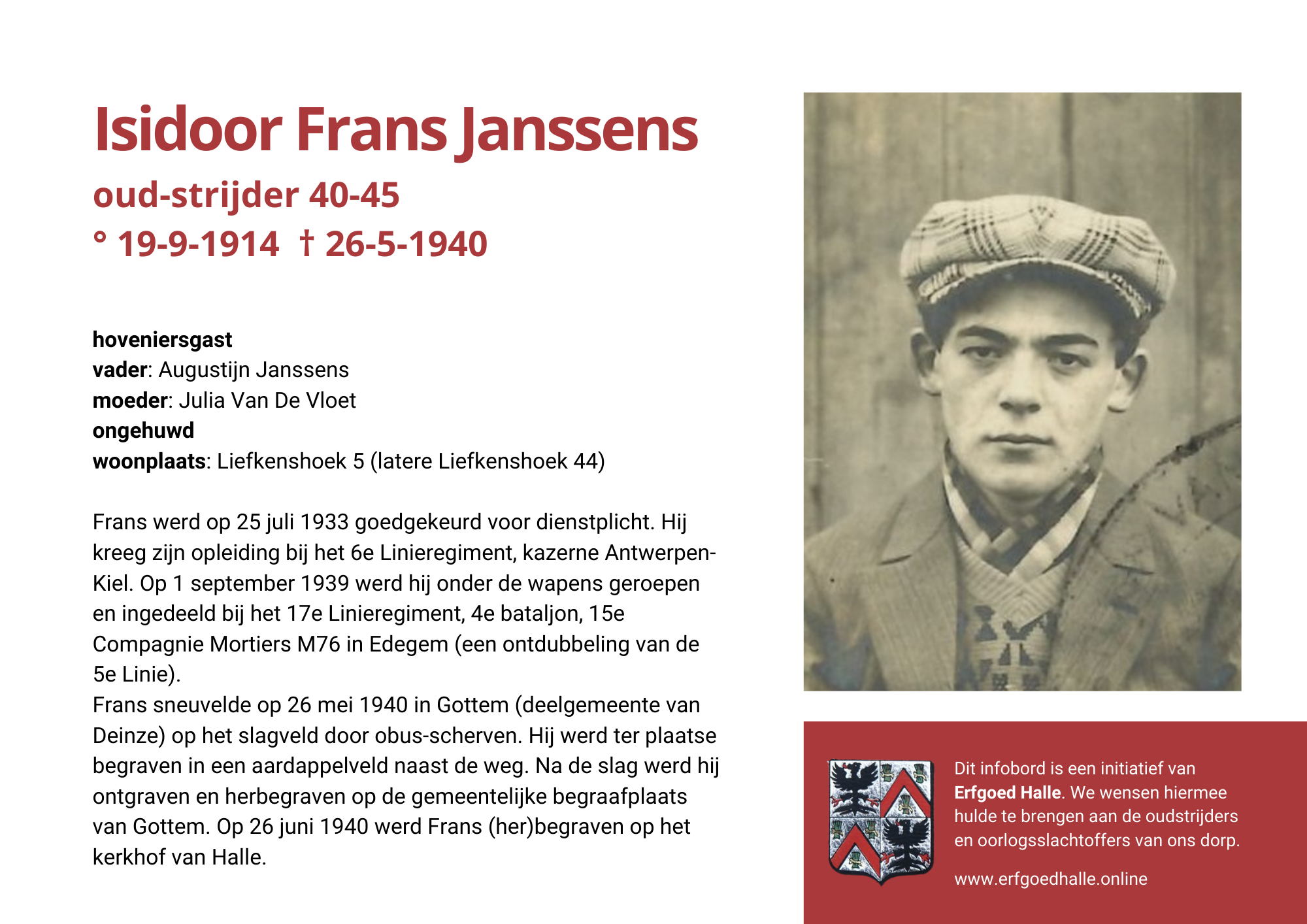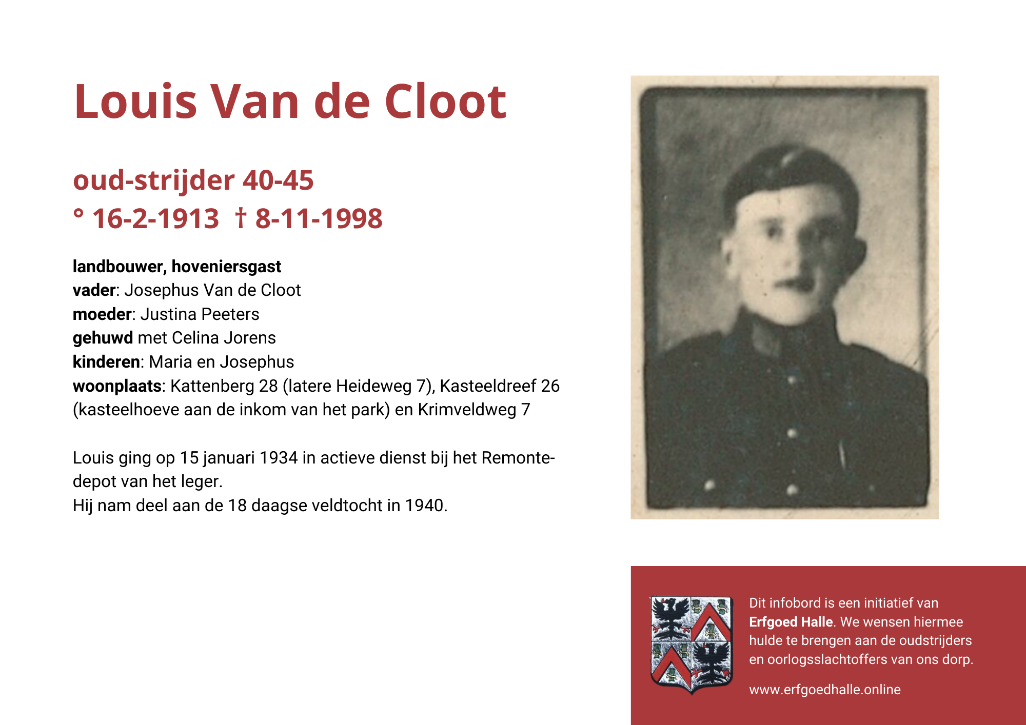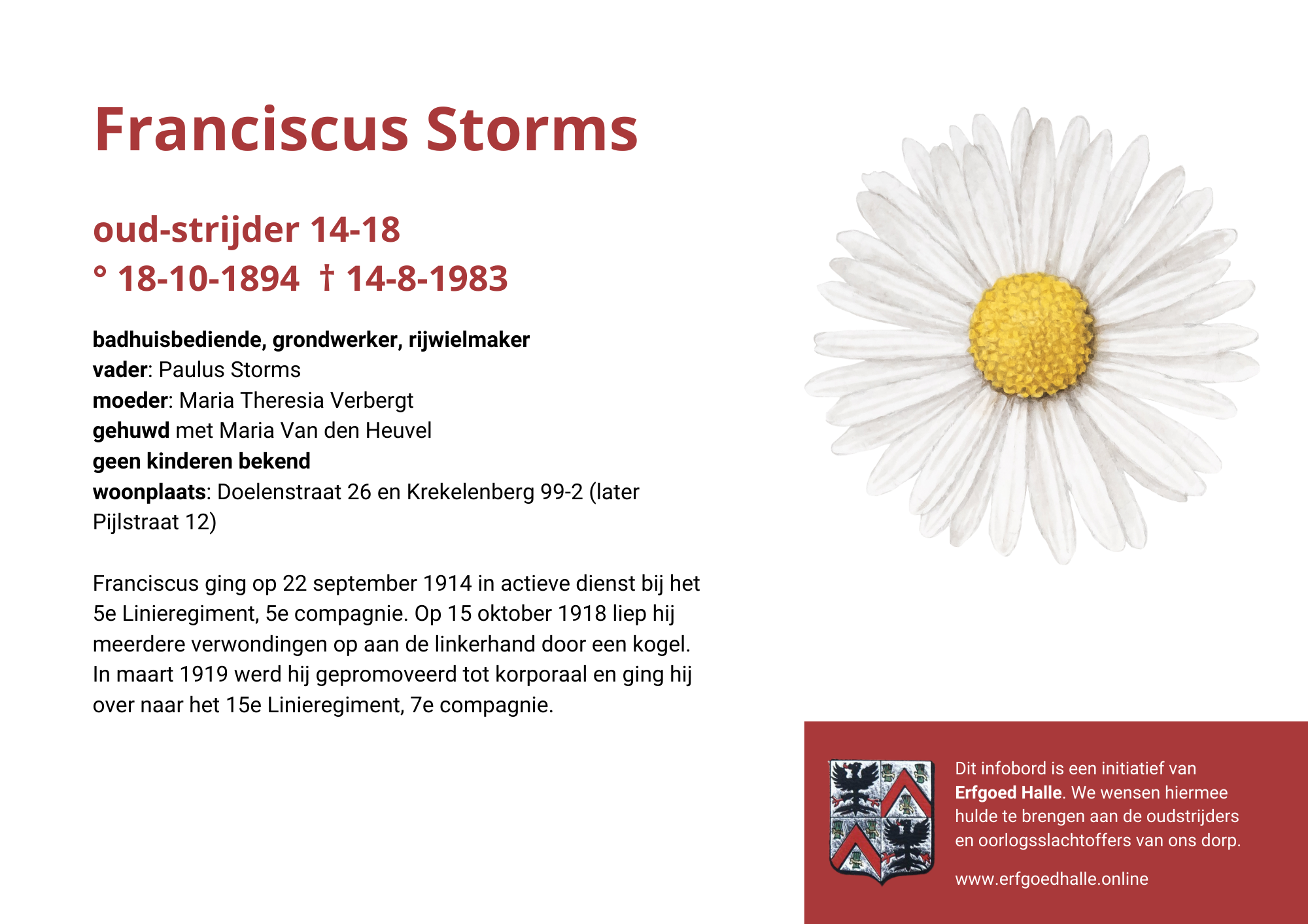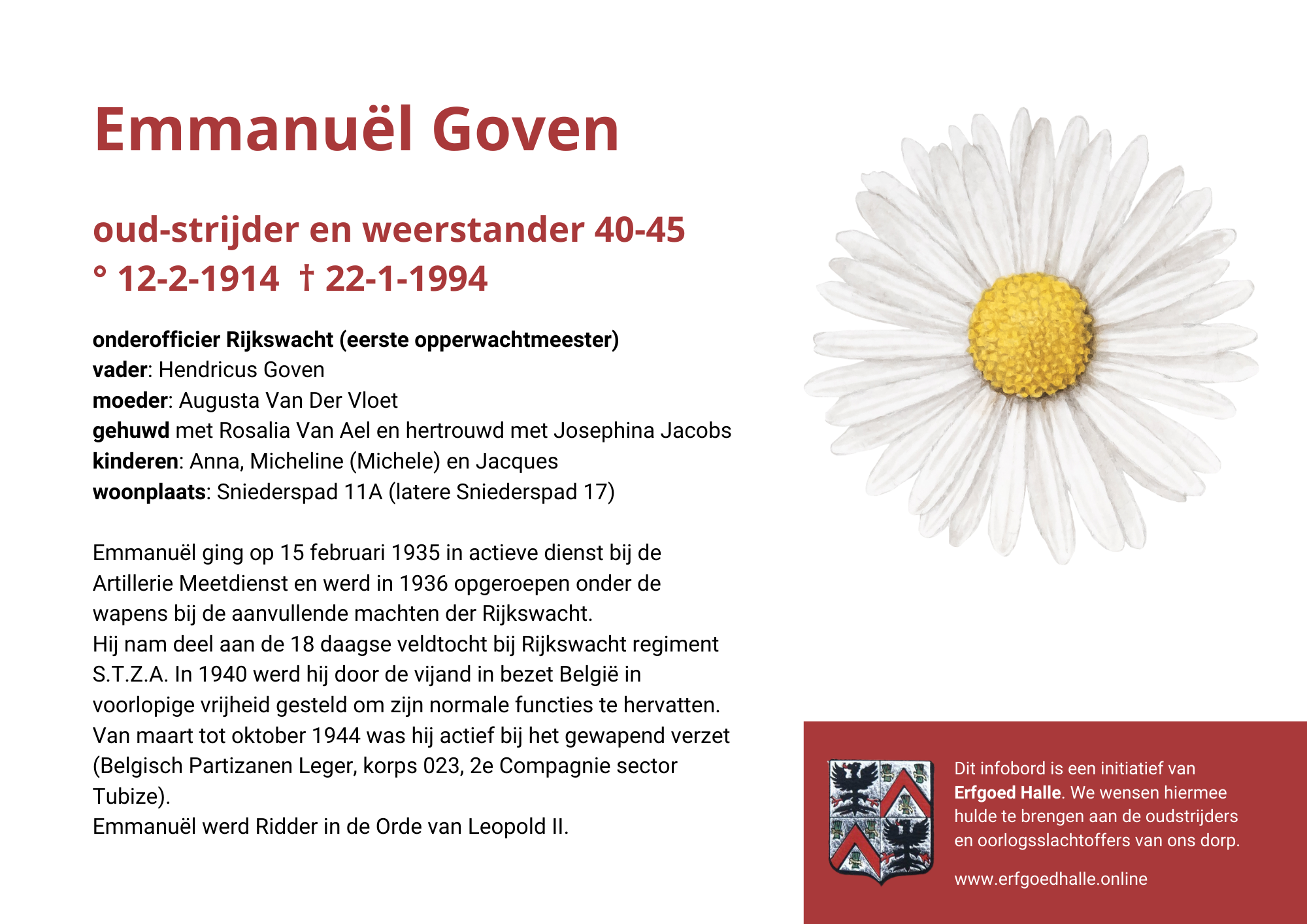 Danny Van de Velde: “We hebben vanuit Erfgoed Halle de voorbije jaren heel veel informatie en documentatie verzameld over onze oud-strijders en de oorlogsslachtoffers die te betreuren vielen. Naar aanleiding van 80 jaar bevrijding van Halle wilden we graag hulde brengen aan hen. Daarom maakten we herinneringsbordjes met meer informatie. Wat was hun beroep, wie waren hun ouders en kinderen, waar hebben ze gewoond? Van heel wat Hallenaren hebben we ook meer info en ook een foto uit het militair dossier toegevoegd. Op de herinneringsbordjes van wie we geen foto hebben, plaatsten we een madeliefje.”
