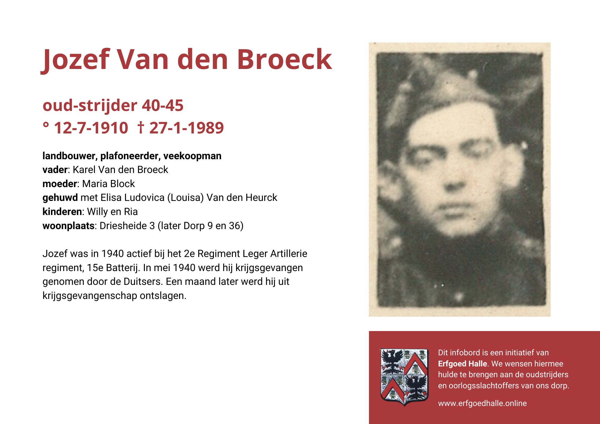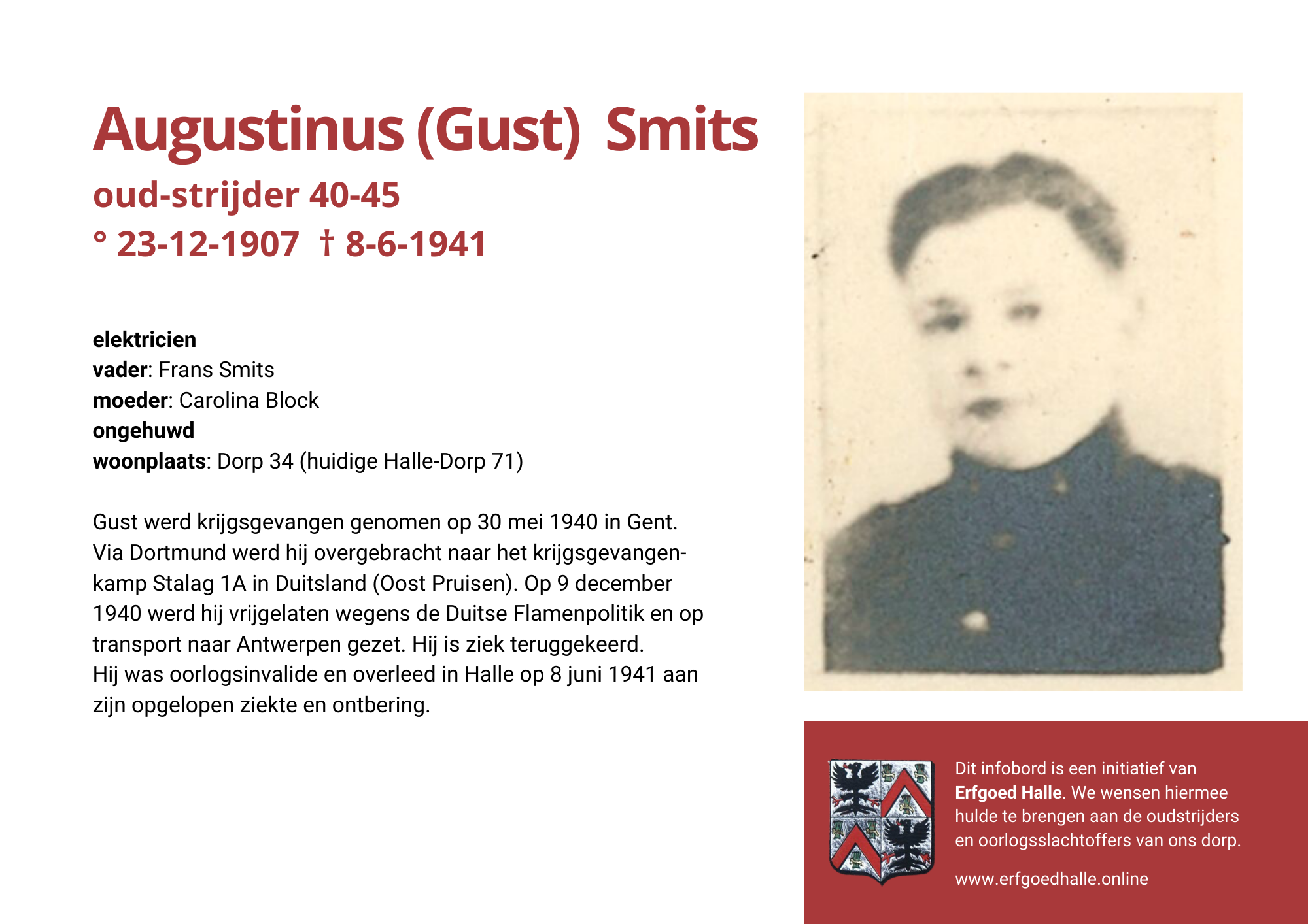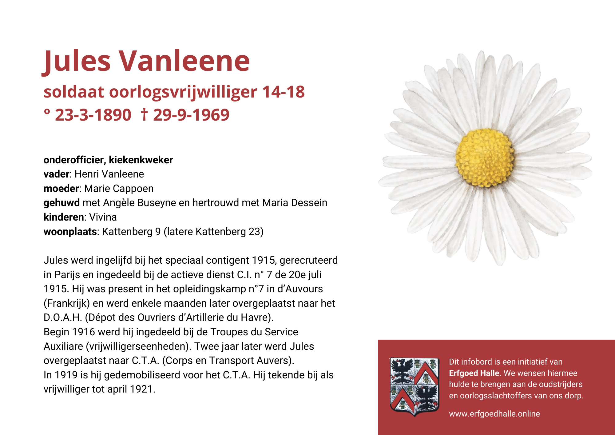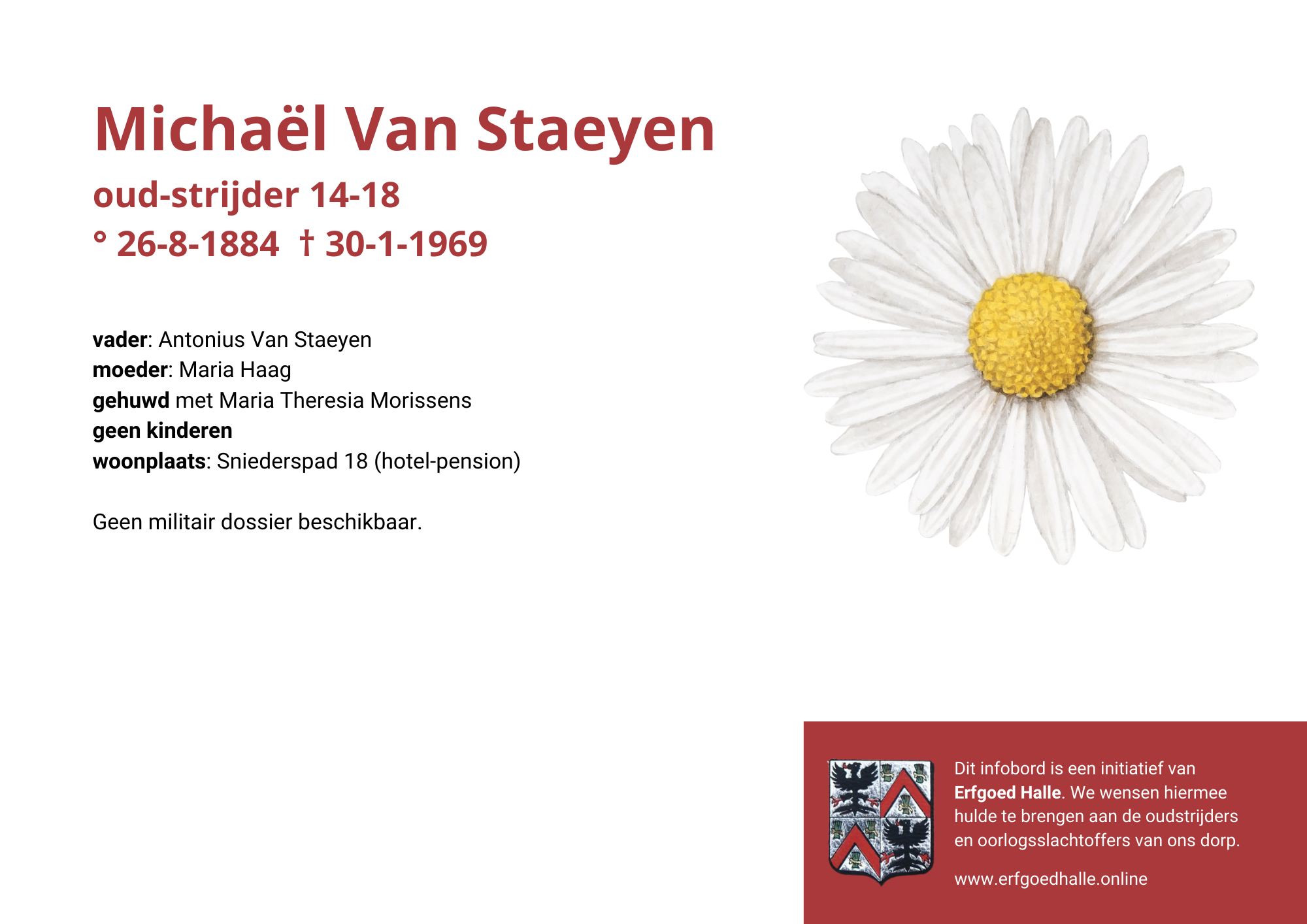 Danny Van de Velde: “We hebben vanuit Erfgoed Halle de voorbije jaren heel veel informatie en documentatie verzameld over onze oud-strijders en de oorlogsslachtoffers die te betreuren vielen. Naar aanleiding van 80 jaar bevrijding van Halle wilden we graag hulde brengen aan hen. Daarom maakten we herinneringsbordjes met meer informatie. Wat was hun beroep, wie waren hun ouders en kinderen, waar hebben ze gewoond? Van heel wat Hallenaren hebben we ook meer info en ook een foto uit het militair dossier toegevoegd. Op de herinneringsbordjes van wie we geen foto hebben, plaatsten we een madeliefje.”