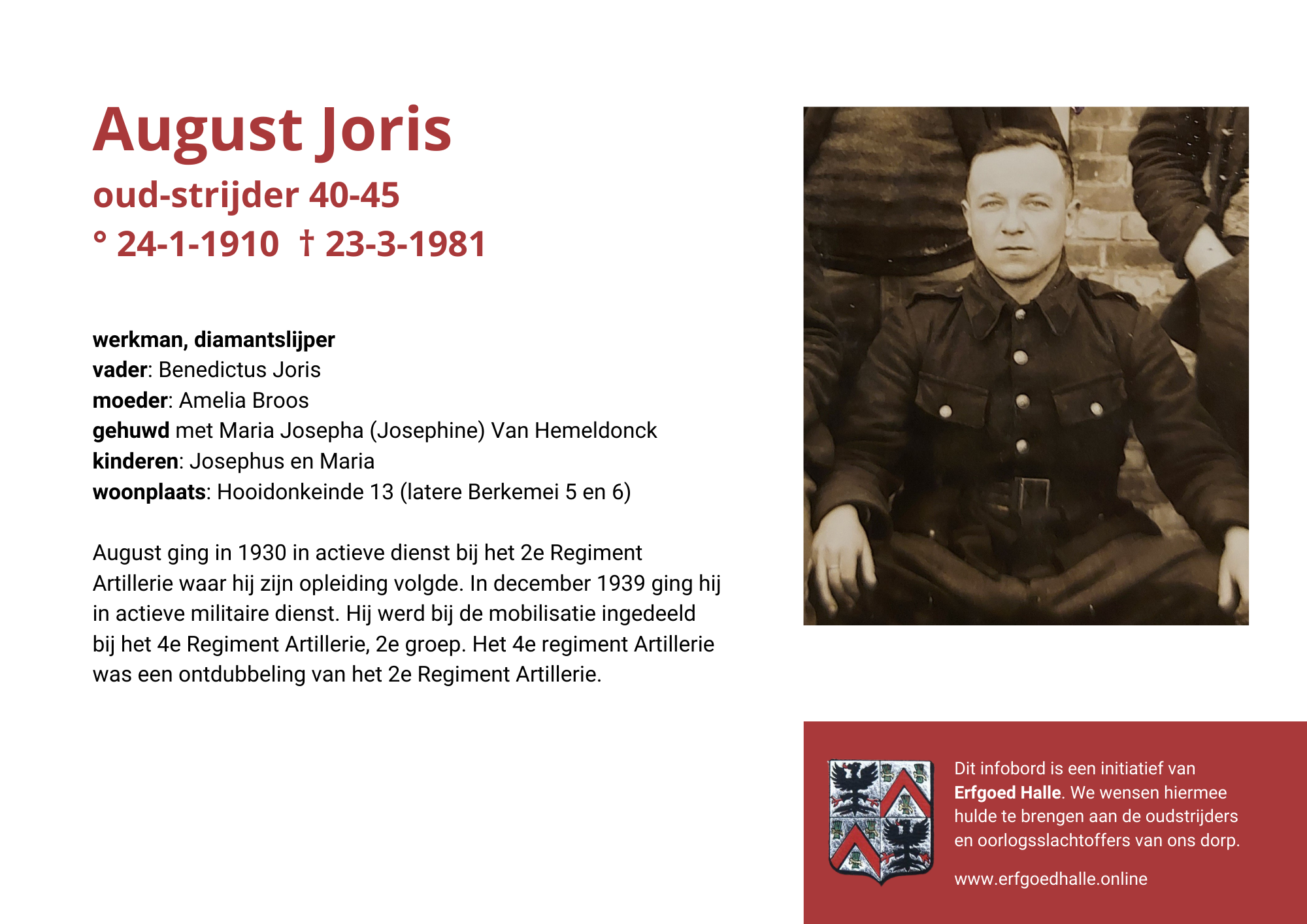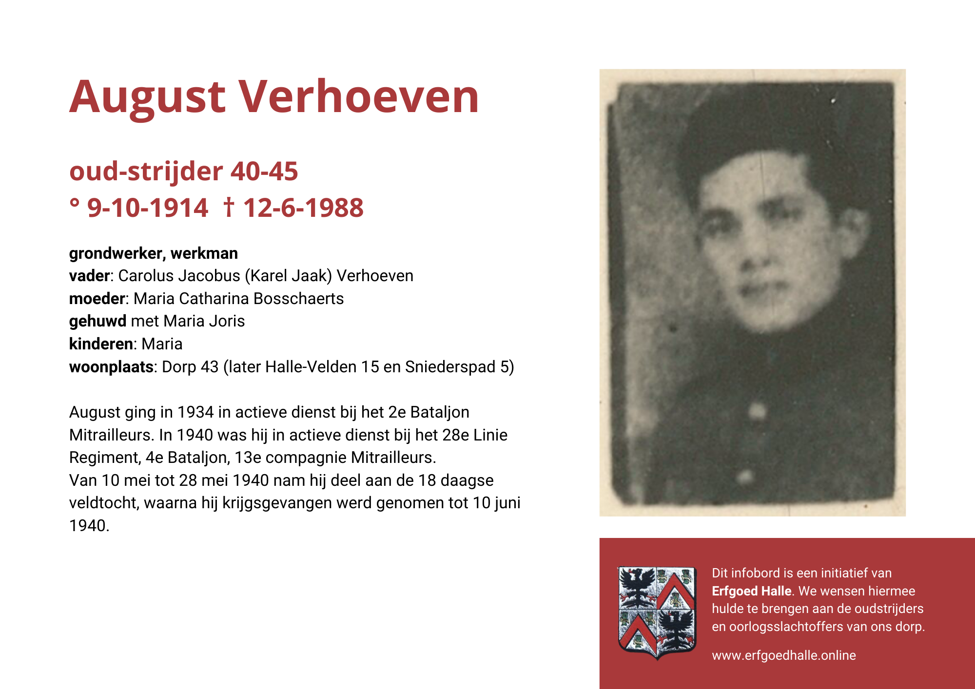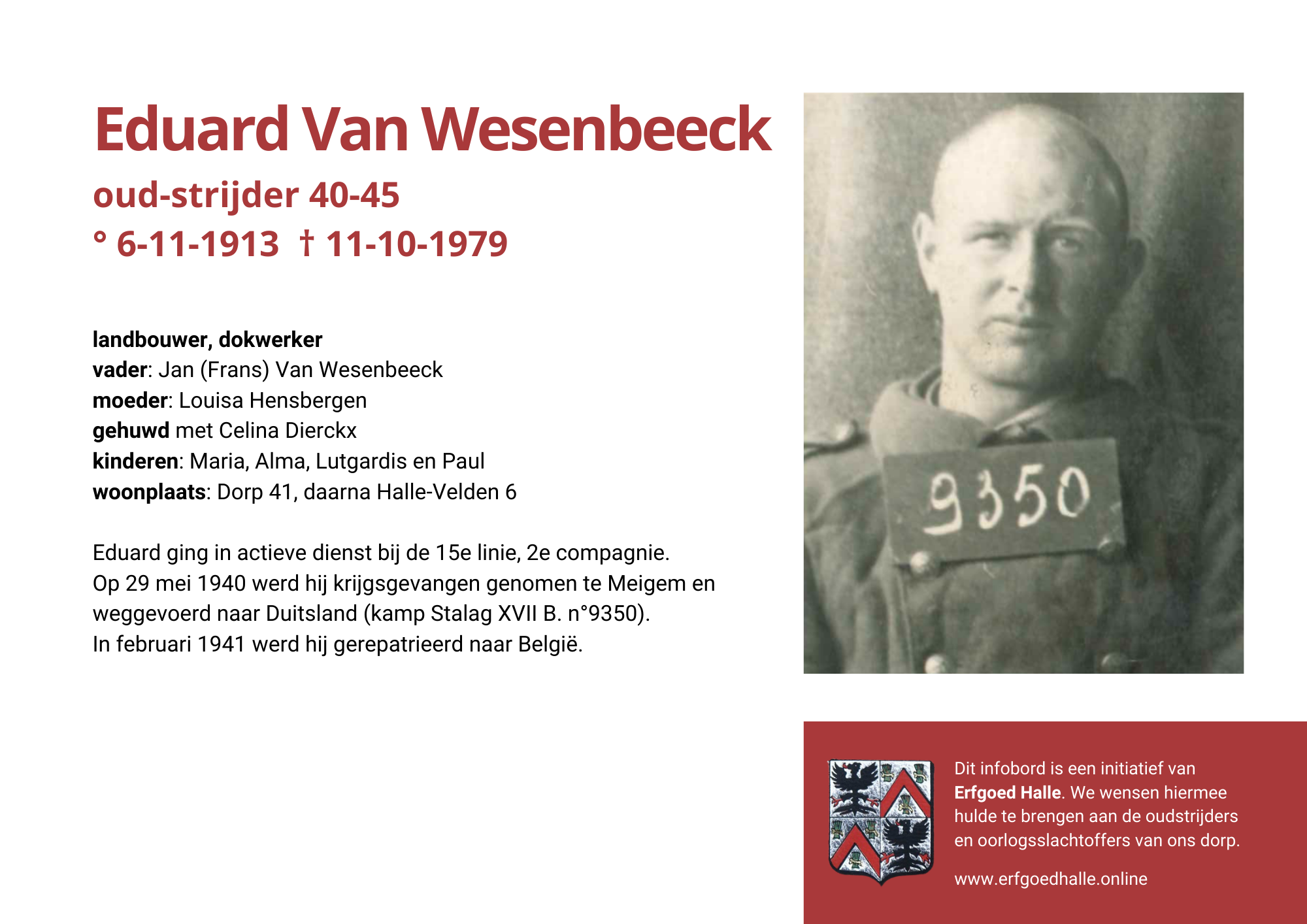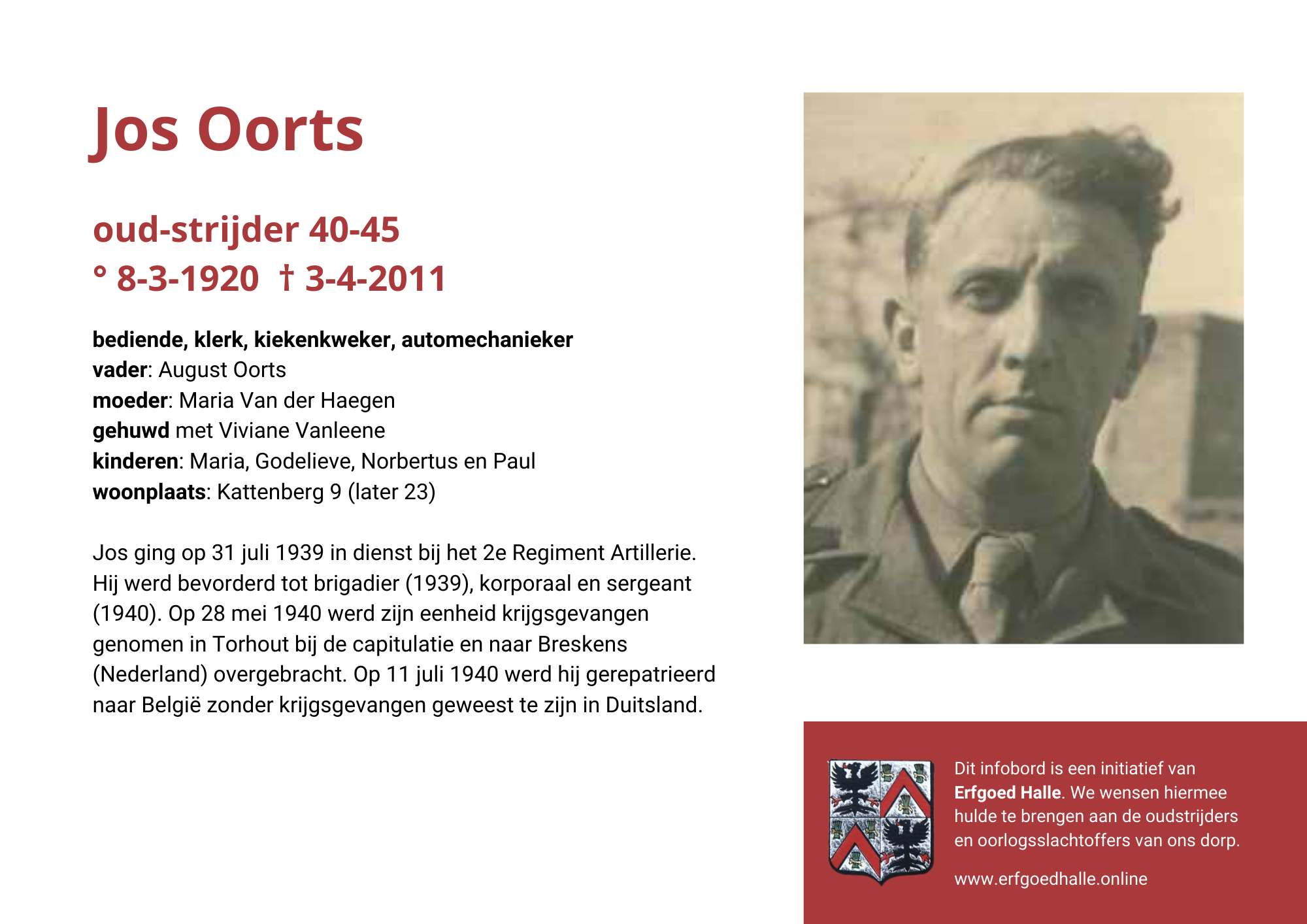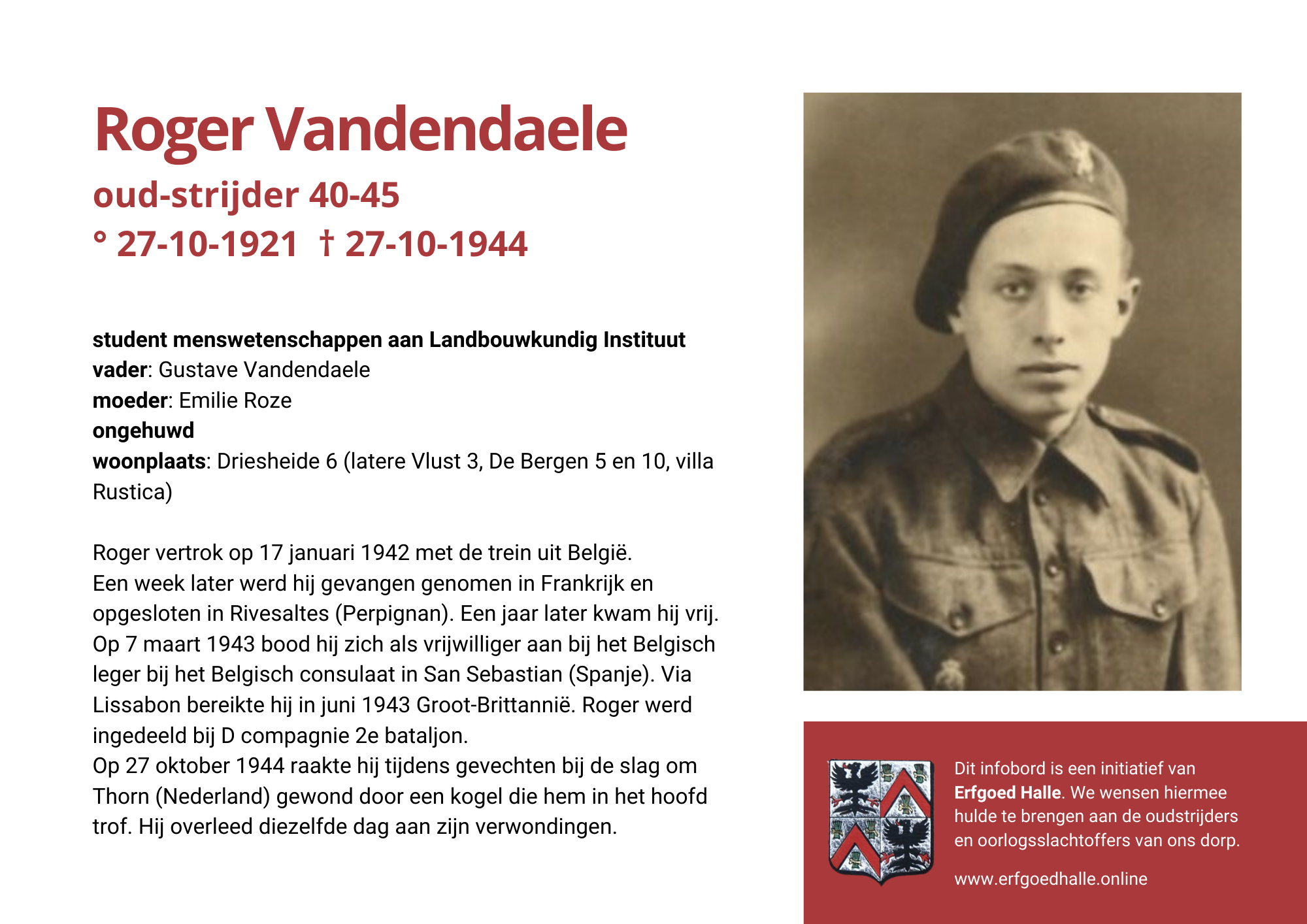 Danny Van de Velde: “We hebben vanuit Erfgoed Halle de voorbije jaren heel veel informatie en documentatie verzameld over onze oud-strijders en de oorlogsslachtoffers die te betreuren vielen. Naar aanleiding van 80 jaar bevrijding van Halle wilden we graag hulde brengen aan hen. Daarom maakten we herinneringsbordjes met meer informatie. Wat was hun beroep, wie waren hun ouders en kinderen, waar hebben ze gewoond? Van heel wat Hallenaren hebben we ook meer info en ook een foto uit het militair dossier toegevoegd. Op de herinneringsbordjes van wie we geen foto hebben, plaatsten we een madeliefje.”