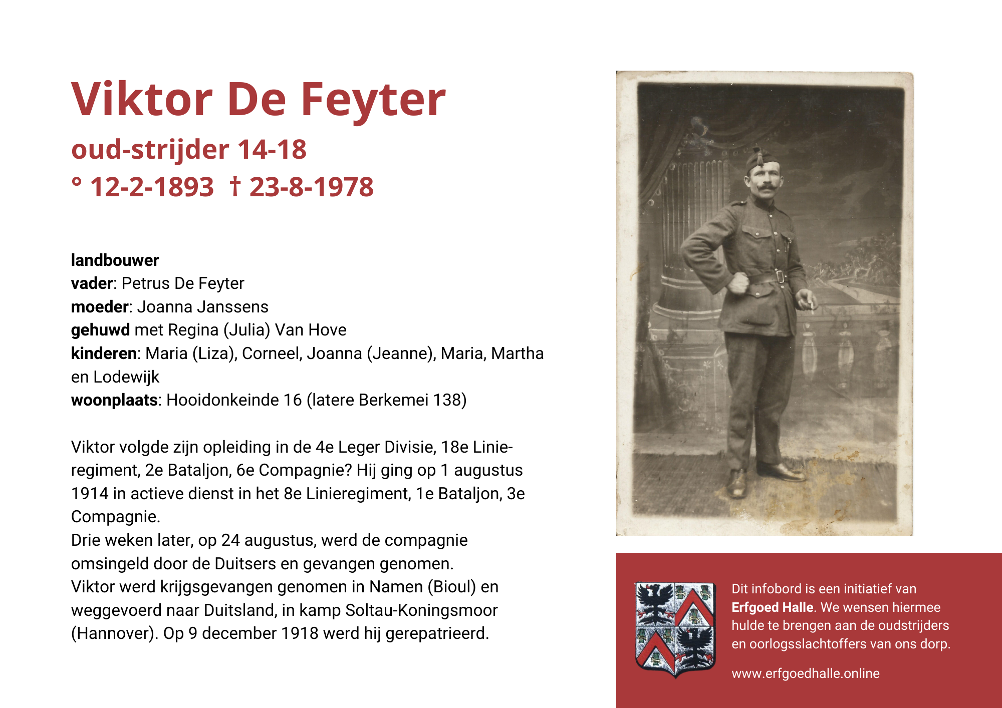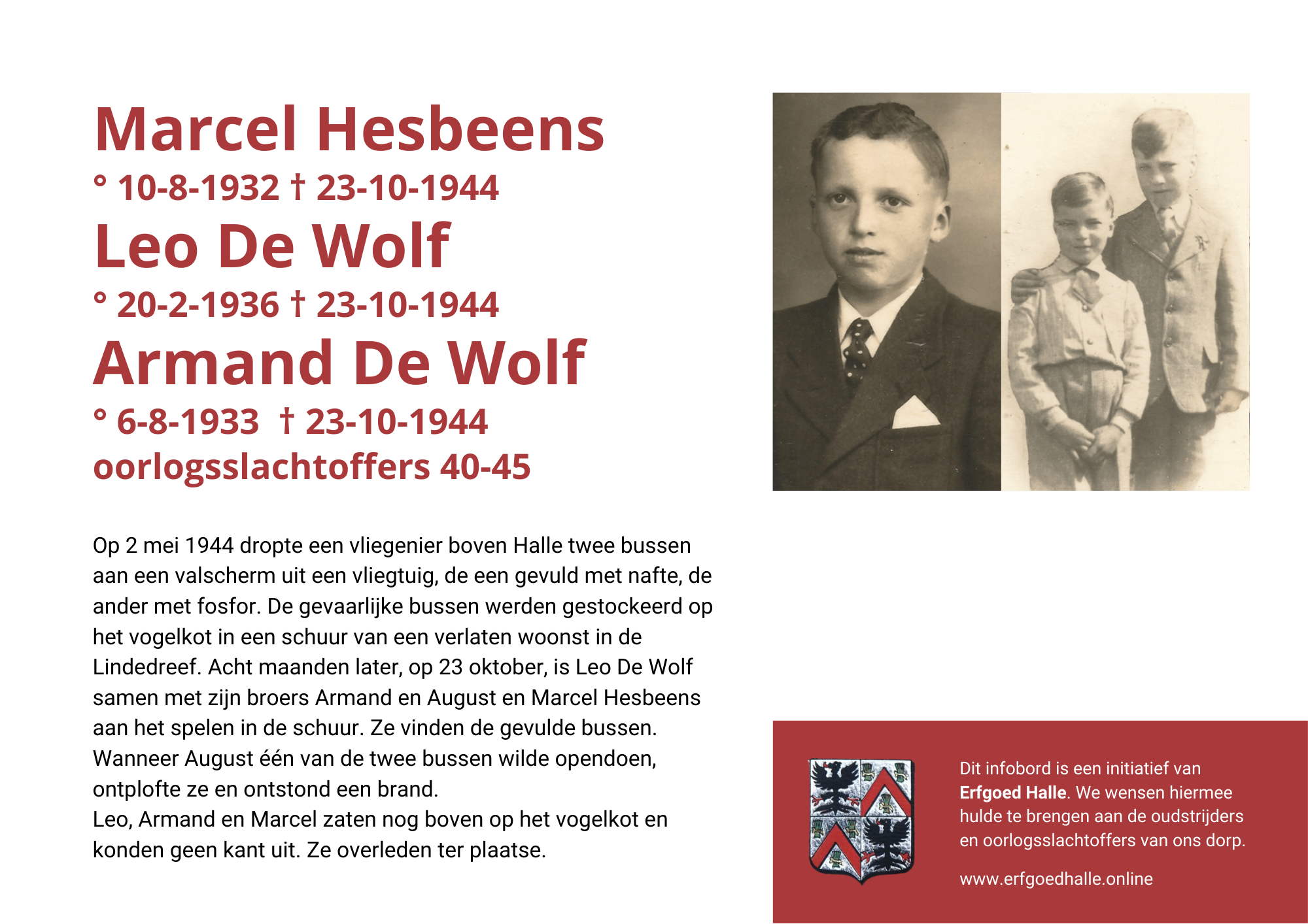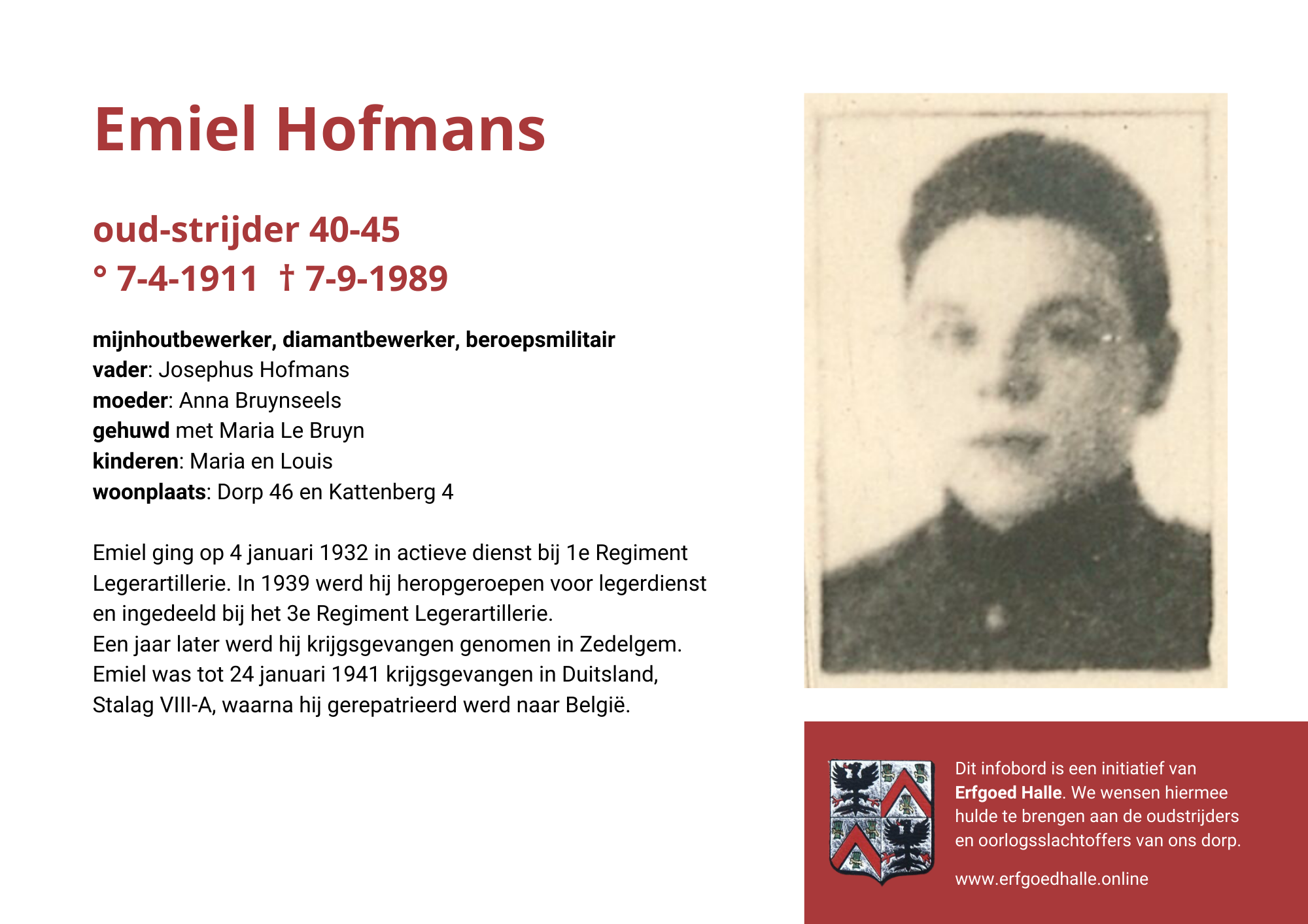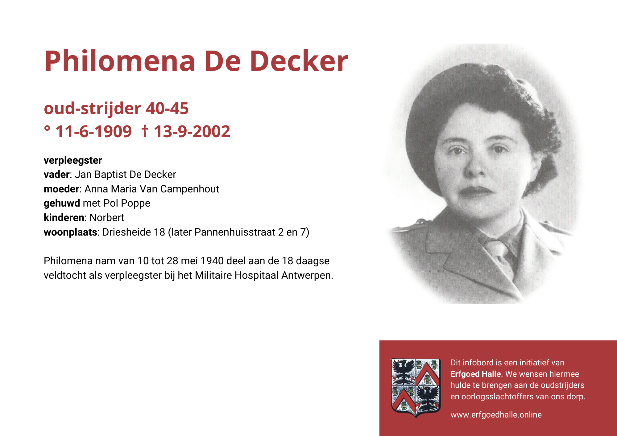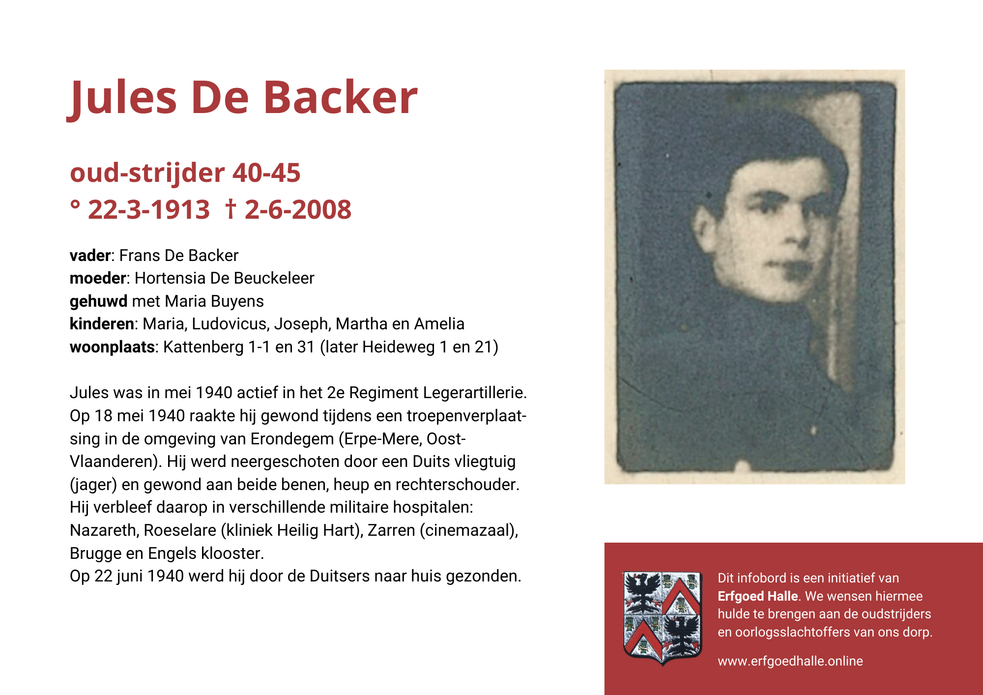 Danny Van de Velde: “We hebben vanuit Erfgoed Halle de voorbije jaren heel veel informatie en documentatie verzameld over onze oud-strijders en de oorlogsslachtoffers die te betreuren vielen. Naar aanleiding van 80 jaar bevrijding van Halle wilden we graag hulde brengen aan hen. Daarom maakten we herinneringsbordjes met meer informatie. Wat was hun beroep, wie waren hun ouders en kinderen, waar hebben ze gewoond? Van heel wat Hallenaren hebben we ook meer info en ook een foto uit het militair dossier toegevoegd. Op de herinneringsbordjes van wie we geen foto hebben, plaatsten we een madeliefje.”